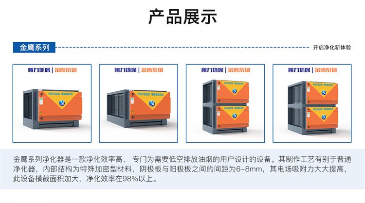 【金鷹系列單門型凈化器】金鷹系列凈化器是一款凈化效率高、專門為需要低空排放油煙的用戶設(shè)計(jì)的設(shè)備。其制作工藝有別于普通凈化器,內(nèi)部結(jié)構(gòu)為特殊加密型材料,陰極板與陽(yáng)極板之間的間距為6- -8mm,其電場(chǎng)吸附力大大提高,此設(shè)備橫截面積加大,凈化效率在98%以上。